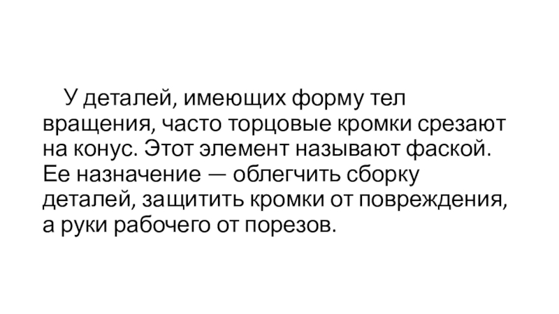 У деталей, имеющих форму тел вращения, часто торцовые кромки срезают на конус. Этот элемент называют
