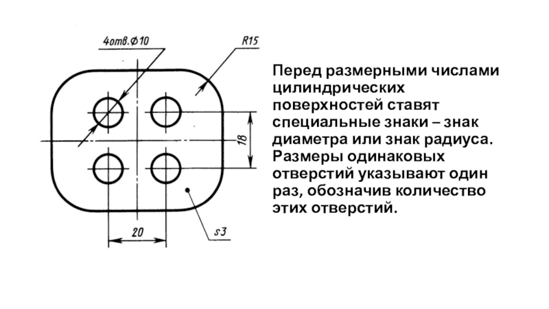или знак радиуса. Размеры одинаковых отверстий указывают один раз, обозначив количество этих отверстий.