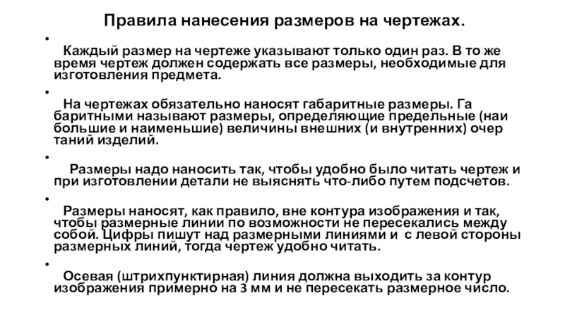 Правила нанесения размеров на чертежах.    Каждый размер на чертеже указывают только один раз. В то же время чертеж должен содержать все размеры, необхо­димые для изготовления предмета.    На чертежах обязательно наносят габаритные размеры. Га­баритными называют