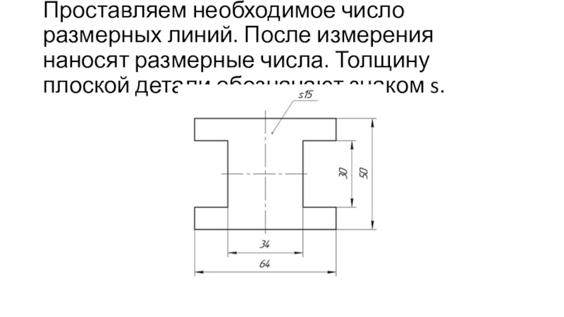 Проставляем необходимое число размерных линий. После измерения наносят размерные числа. Толщину плоской детали обозначают знаком s.