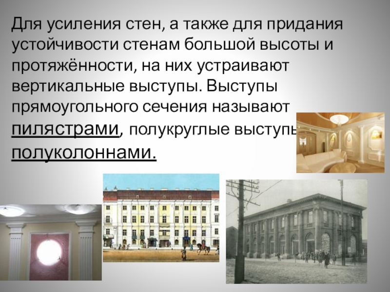 и протяжённости, на них устраивают вертикальные выступы. Выступы прямоугольного сечения называют пилястрами, полукруглые выступы – полуколоннами.