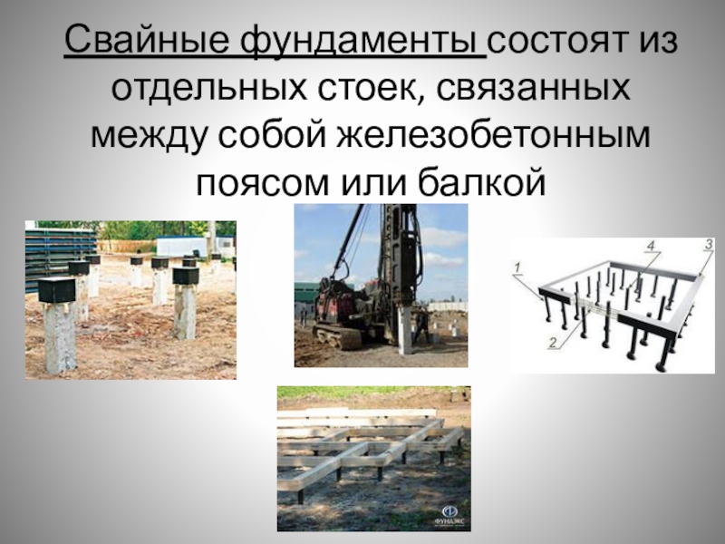 Слайд 9Свайные фундаменты состоят из отдельных стоек, связанных между собой железобетонным поясом
