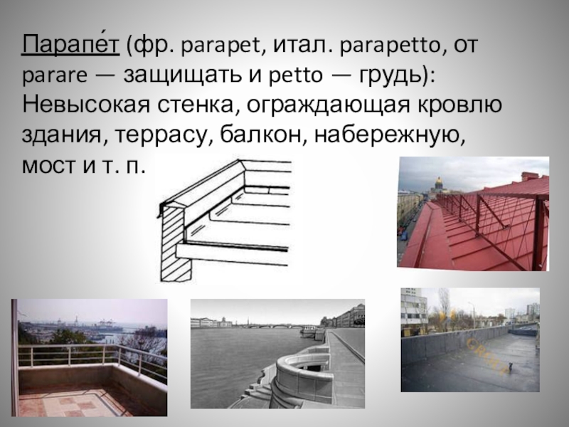 Невысокая стенка, ограждающая кровлю здания, террасу, балкон, набережную, мост и т. п.