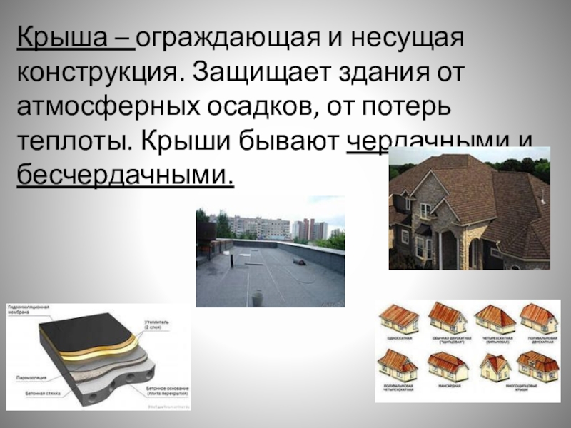 Крыша – ограждающая и несущая конструкция. Защищает здания от атмосферных осадков,