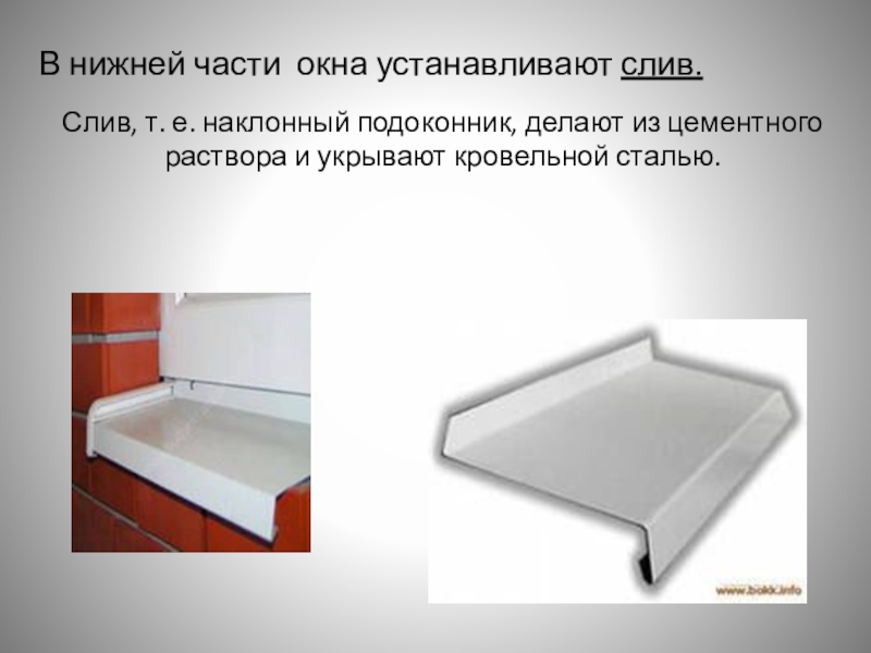 подоконник, делают из цементного раствора и укрывают кровельной сталью.