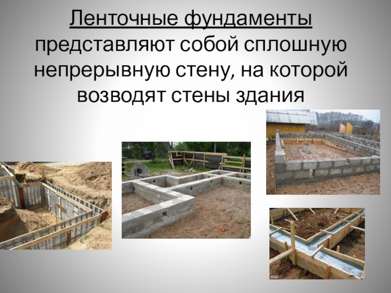 Слайд 6Ленточные фундаменты представляют собой сплошную непрерывную стену, на которой возводят стены