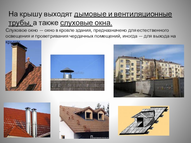 На крышу выходят дымовые и вентиляционные трубы, а также слуховые