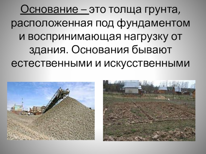 Слайд 4Основание – это толща грунта, расположенная под фундаментом и воспринимающая нагрузку
