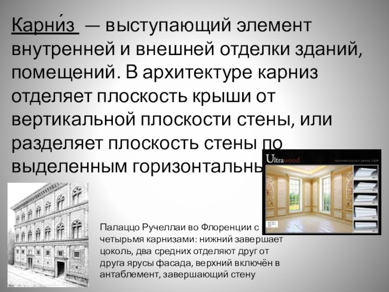 архитектуре карниз отделяет плоскость крыши от вертикальной плоскости стены, или разделяет плоскость стены по выделенным горизонтальным линиям.