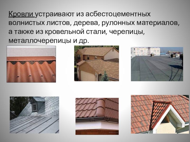 Кровли устраивают из асбестоцементных волнистых листов, дерева, рулонных материалов, а