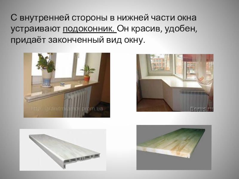 С внутренней стороны в нижней части окна устраивают подоконник. Он