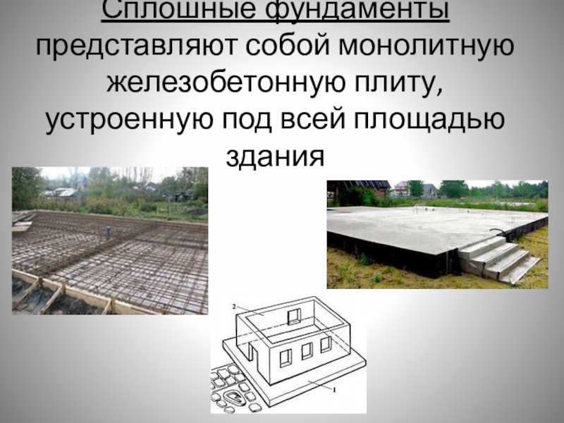 Слайд 8Сплошные фундаменты представляют собой монолитную железобетонную плиту, устроенную под всей площадью
