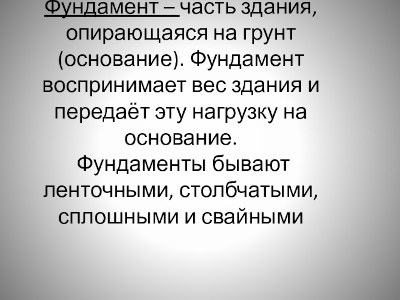 Слайд 5Фундамент – часть здания, опирающаяся на грунт (основание). Фундамент воспринимает вес