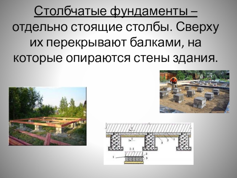 Слайд 7Столбчатые фундаменты – отдельно стоящие столбы. Сверху их перекрывают балками, на