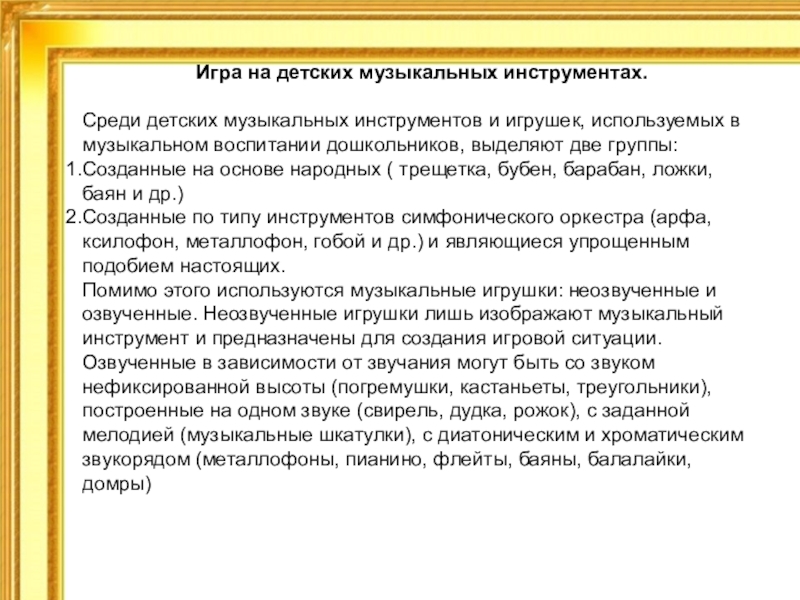 Помимо этого используются музыкальные игрушки: неозвученные и озвученные. Неозвученные игрушки лишь изображают музыкальный инструмент и предназначены для создания игровой ситуации.