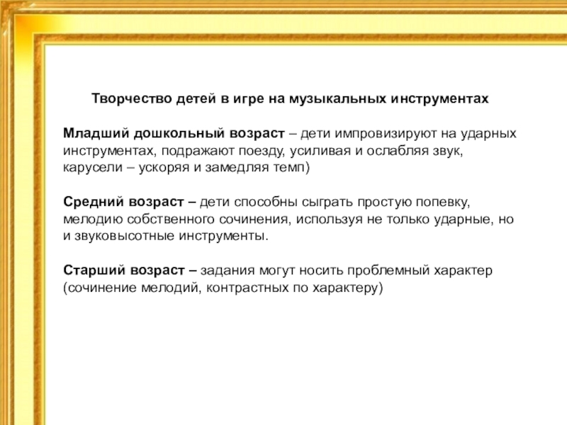Средний возраст – дети способны сыграть простую попевку, мелодию собственного сочинения, используя не только ударные, но и звуковысотные инструменты.
