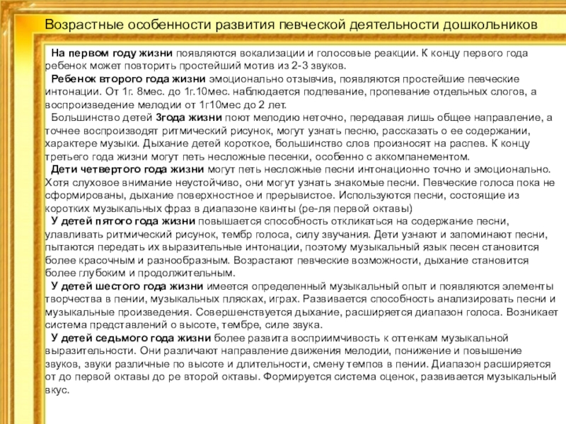 Слайд 9Возрастные особенности развития певческой деятельности дошкольников