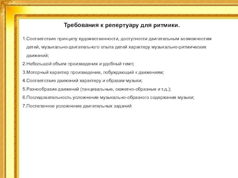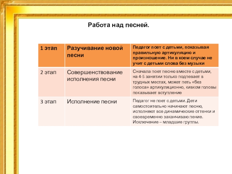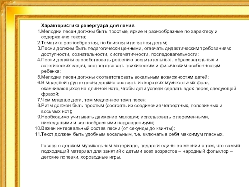 Песни должны быть педагогически ценными, отвечать дидактическим требованиям: доступности, сознательности, систематичности, последовательности;
