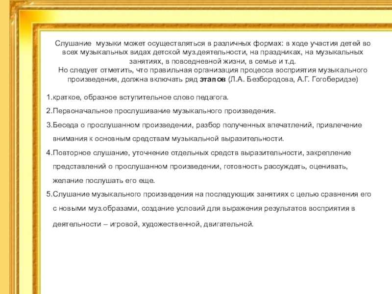 Но следует отметить, что правильная организация процесса восприятия музыкального произведения, должна включать ряд этапов (Л.А. Безбородова, А.Г. Гогоберидзе)