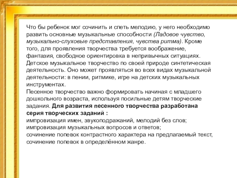 развить основные музыкальные способности (Ладовое чувство, музыкально-слуховые представления, чувства ритма). Кроме того, для проявления творчества требуется воображение, фантазия, свободное ориентировка в непривычных ситуациях. Детское музыкальное творчество по своей природе синтетическая деятельность. Оно может проявляться во всех видах музыкальной деятельности: в пении, ритмике, игре на детских музыкальных инструментах.