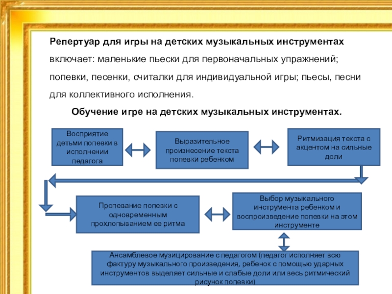 Слайд 17Репертуар для игры на детских музыкальных инструментах включает: маленькие пьески для