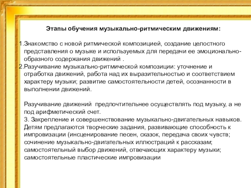 Слайд 15Этапы обучения музыкально-ритмическим движениям: