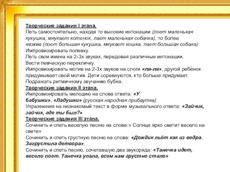 Песенное творчество важно формировать начиная с младшего дошкольного возраста, используя посильные детям творческие задания. Для развития песенного творчества разработана серия творческих заданий :