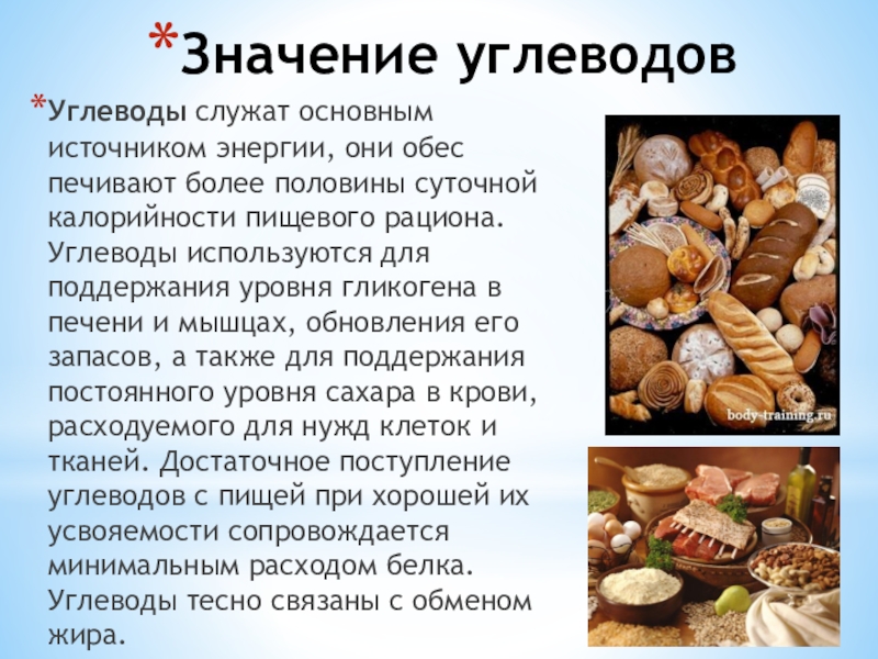 пищевого рациона. Углеводы используются для поддержания уровня гликогена в печени и мышцах, обновления его запасов, а также для поддержания постоянного уровня сахара в крови, расходуемого для нужд клеток и тканей. Достаточное поступление углеводов с пищей при хорошей их усвояемости сопровождается минимальным расходом белка. Углеводы тесно связаны с обменом жира.