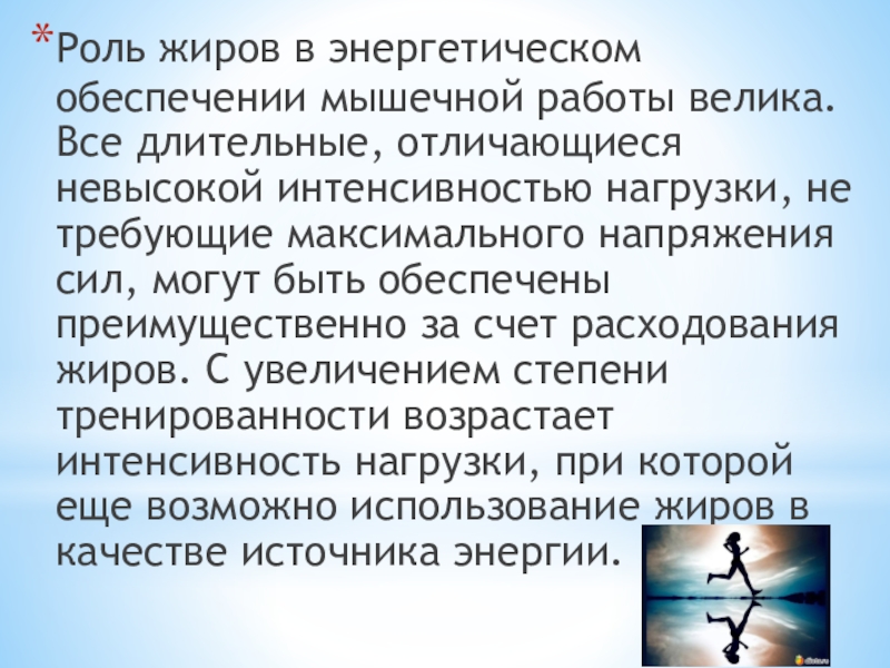 Слайд 5Роль жиров в энергетическом обеспечении мышечной работы велика. Все длительные, отличающиеся