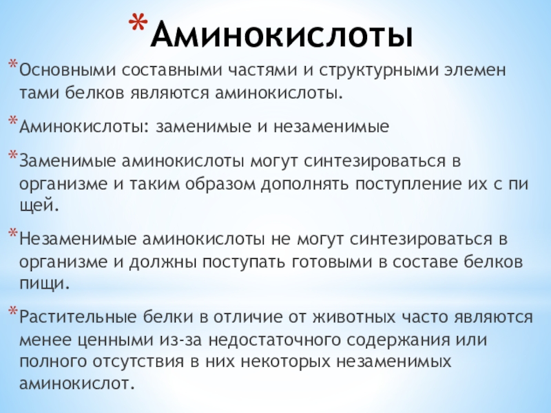 Незаменимые аминокислоты не могут синтезироваться в организме и должны поступать готовыми в составе белков пищи.