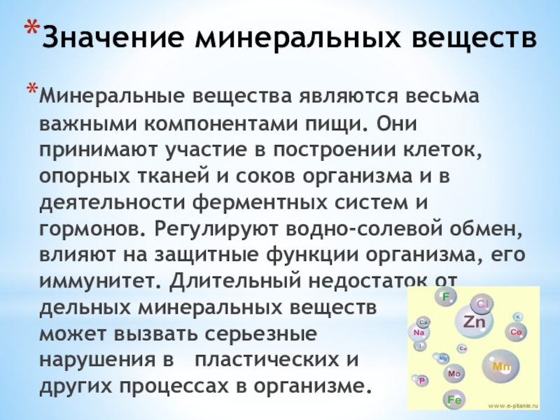 в построении клеток, опорных тканей и соков организма и в деятельности ферментных систем и гормонов. Регулируют водно-солевой обмен, влияют на защитные функции организма, его иммунитет. Длительный недостаток отдельных минеральных веществ может вызвать серьезные нарушения в пластических и других процессах в организме.