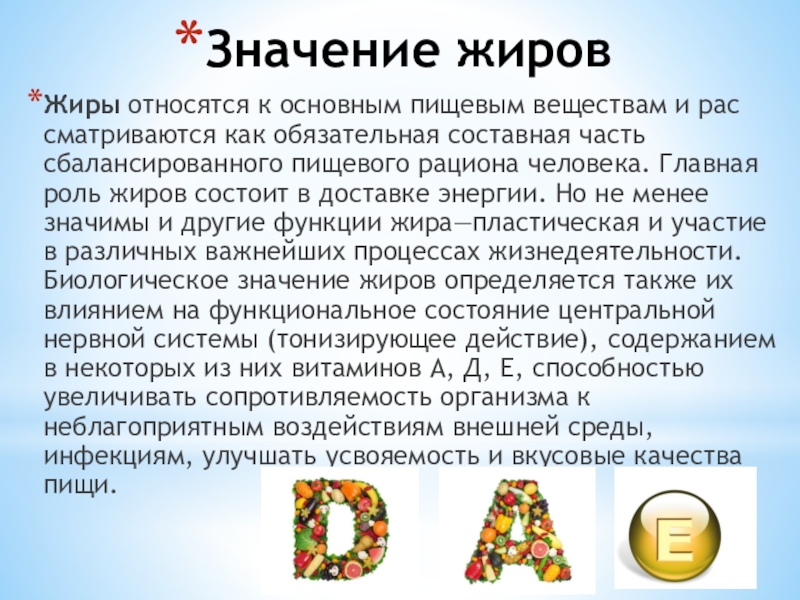составная часть сбалансированного пищевого рациона человека. Главная роль жиров состоит в доставке энергии. Но не менее значимы и другие функции жира—пластическая и участие в различных важнейших процессах жизнедеятельности. Биологическое значение жиров определяется также их влиянием на функциональное состояние центральной нервной системы (тонизирующее действие), содержанием в некоторых из них витаминов А, Д, Е, способностью увеличивать сопротивляемость организма к неблагоприятным воздействиям внешней среды, инфекциям, улучшать усвояемость и вкусовые качества пищи.