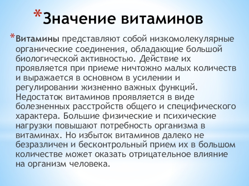 их проявляется при приеме ничтожно малых количеств и выражается в основном в усилении и регулировании жизненно важных функций. Недостаток витаминов проявляется в виде болезненных расстройств общего и специфического характера. Большие физические и психические нагрузки повышают потребность организма в витаминах. Но избыток витаминов далеко не безразличен и бесконтрольный прием их в большом количестве может оказать отрицательное влияние на организм человека.