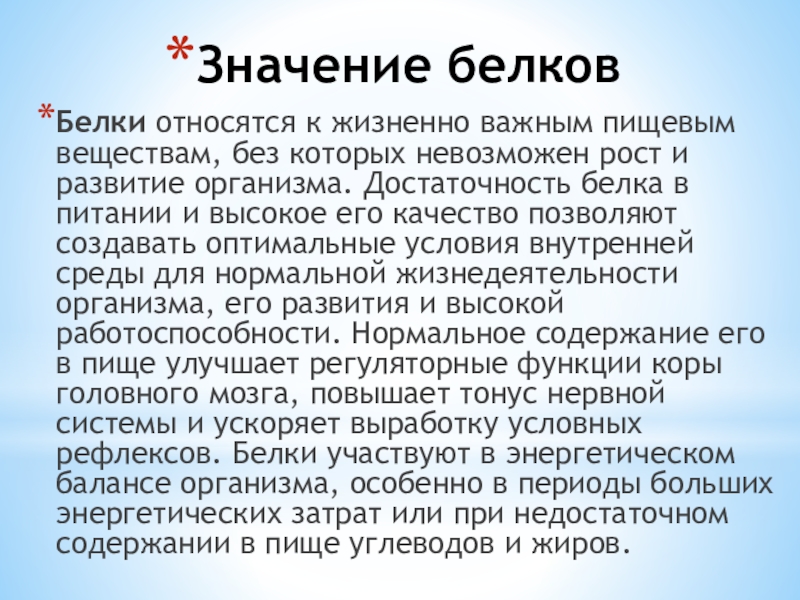 и развитие организма. Достаточность белка в питании и высокое его качество позволяют создавать оптимальные условия внутренней среды для нормальной жизнедеятельности организма, его развития и высокой работоспособности. Нормальное содержание его в пище улучшает регуляторные функции коры головного мозга, повышает тонус нервной системы и ускоряет выработку условных рефлексов. Белки участвуют в энергетическом балансе организма, особенно в периоды больших энергетических затрат или при недостаточном содержании в пище углеводов и жиров.
