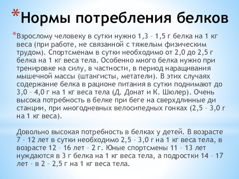 белка на 1 кг веса (при работе, не связанной с тяжелым физическим трудом). Спортсменам в сутки необходимо от 2,0 до 2,5 г белка на 1 кг веса тела. Особенно много белка нужно при тренировке на силу, в частности, в период наращивания мышечной массы (штангисты, метатели). В этих случаях содержание белка в рационе питания в сутки поднимают до 3,0 – 4,0 г на 1 кг веса тела (Д. Донат и К. Шюлер). Очень высока потребность в белке при беге на сверхдлинные дистанции, при многодневных велосипедных гонках (2,5 – 3,0 r на 1 кг веса).
