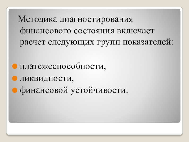 Слайд 11 Методика диагностирования финансового состояния включает расчет следующих групп показателей: