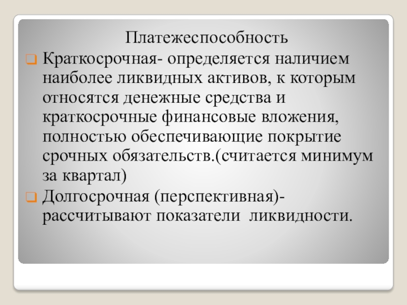 Краткосрочная- определяется наличием наиболее ликвидных активов, к которым относятся денежные средства