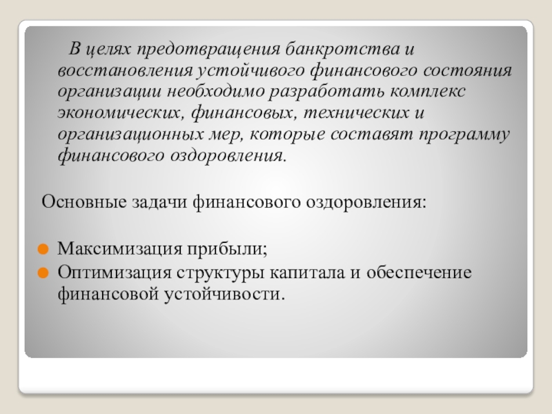 Слайд 20 В целях предотвращения банкротства и восстановления устойчивого финансового состояния организации необходимо