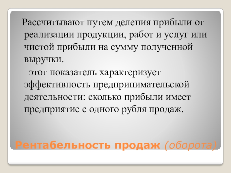 этот показатель характеризует эффективность предпринимательской деятельности: сколько прибыли имеет предприятие с одного рубля продаж.