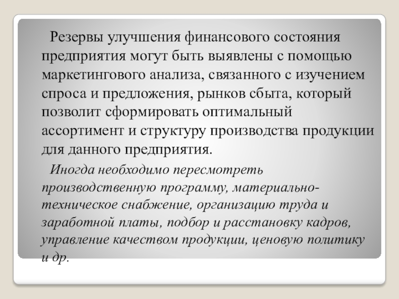 Слайд 19 Резервы улучшения финансового состояния предприятия могут быть выявлены с помощью маркетингового