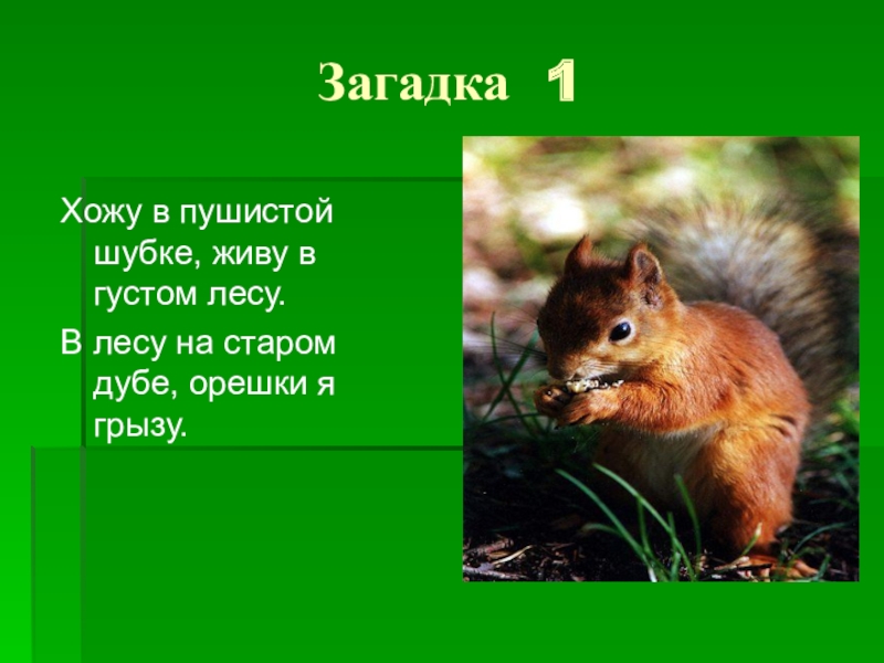 Загадка 1Хожу в пушистой шубке, живу в густом лесу.В лесу на старом дубе, орешки я грызу.