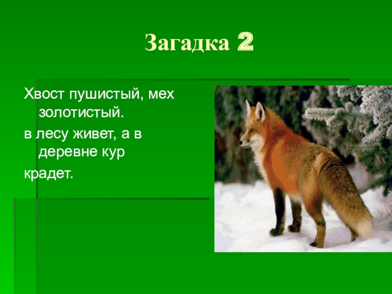 Загадка 2Хвост пушистый, мех золотистый.в лесу живет, а в деревне куркрадет.