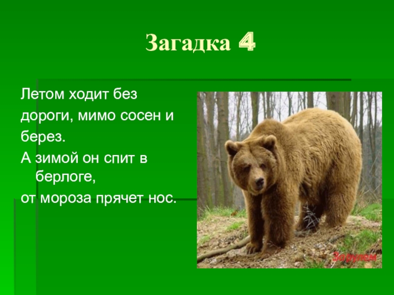 Загадка 4Летом ходит без дороги, мимо сосен и берез.А зимой он спит в берлоге,от мороза прячет нос.
