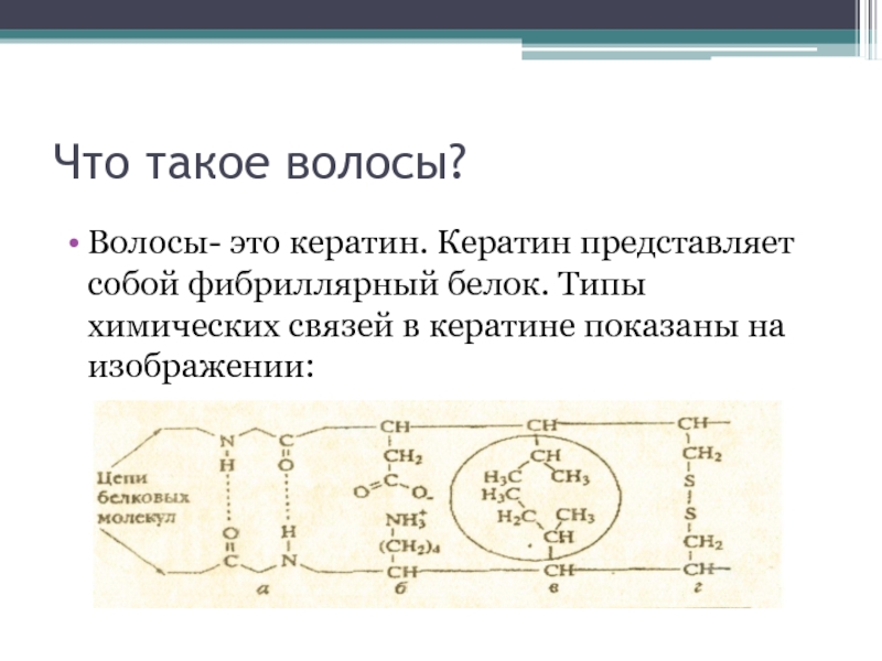 Что такое волосы?Волосы- это кератин. Кератин представляет собой фибриллярный белок. Типы химических связей в кератине показаны на