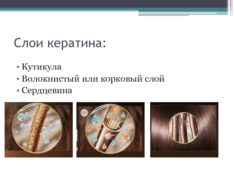 Слои кератина:Кутикула Волокнистый или корковый слой Сердцевина