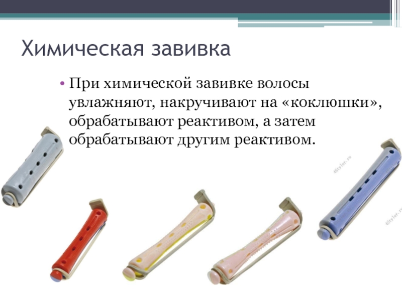 Химическая завивкаПри химической завивке волосы увлажняют, накручивают на «коклюшки», обрабатывают реактивом, а затем обрабатывают другим реактивом.