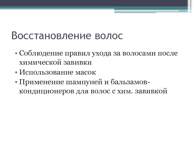 Восстановление волосСоблюдение правил ухода за волосами после химической завивкиИспользование масокПрименение шампуней и бальзамов-кондиционеров для волос с хим.