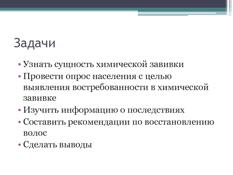 ЗадачиУзнать сущность химической завивкиПровести опрос населения с целью выявления востребованности в химической завивкеИзучить информацию о последствияхСоставить рекомендации
