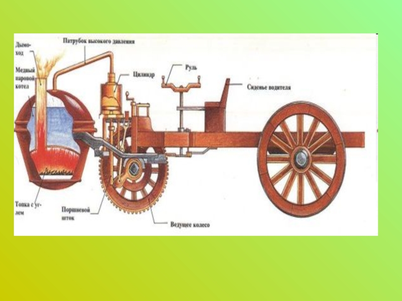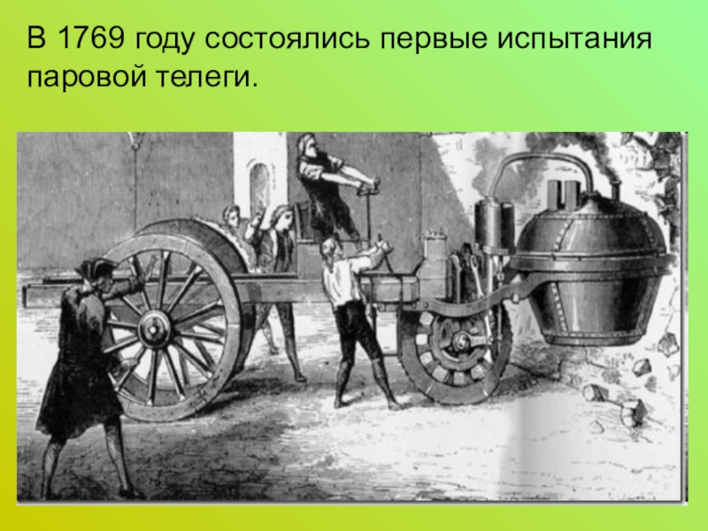 Слайд 20В 1769 году состоялись первые испытания паровой телеги.