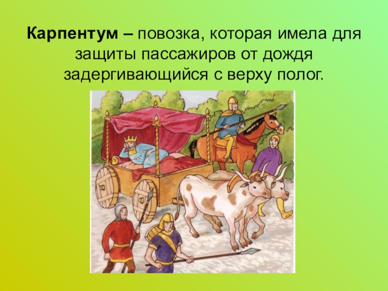 Слайд 10Карпентум – повозка, которая имела для защиты пассажиров от дождя задергивающийся